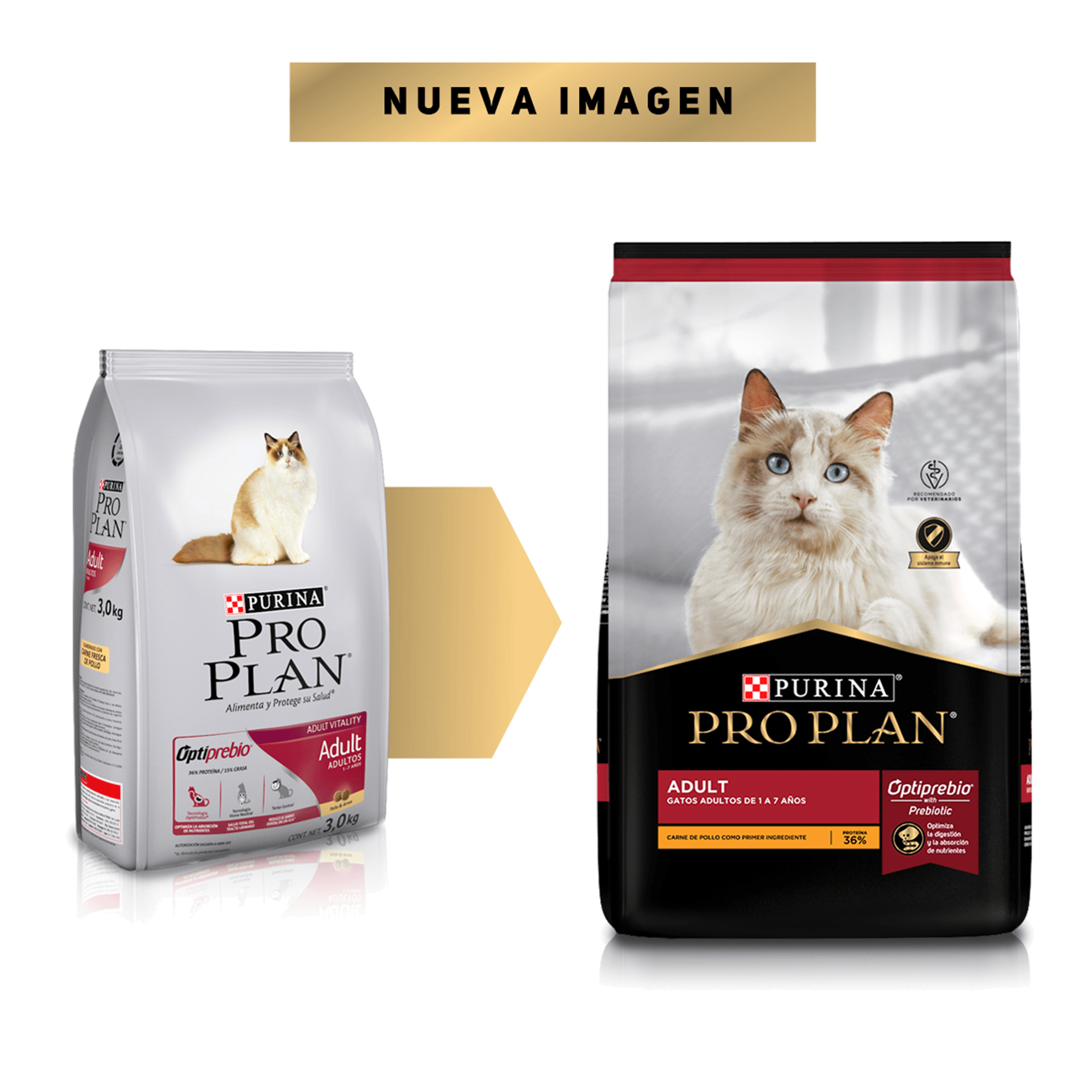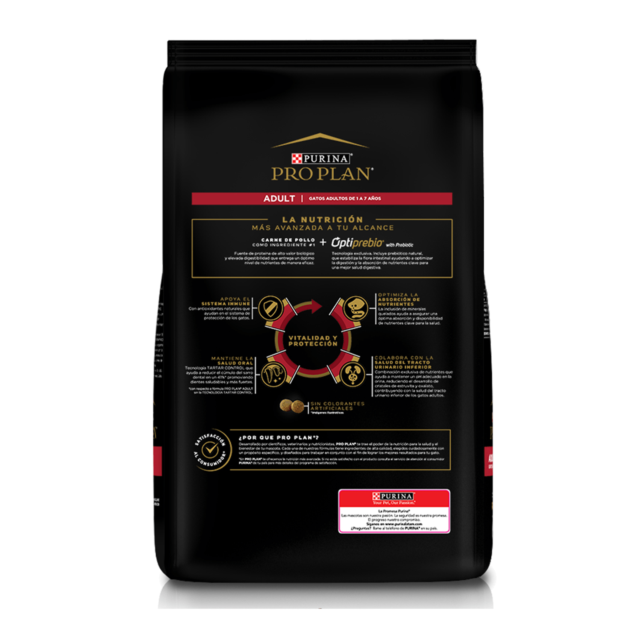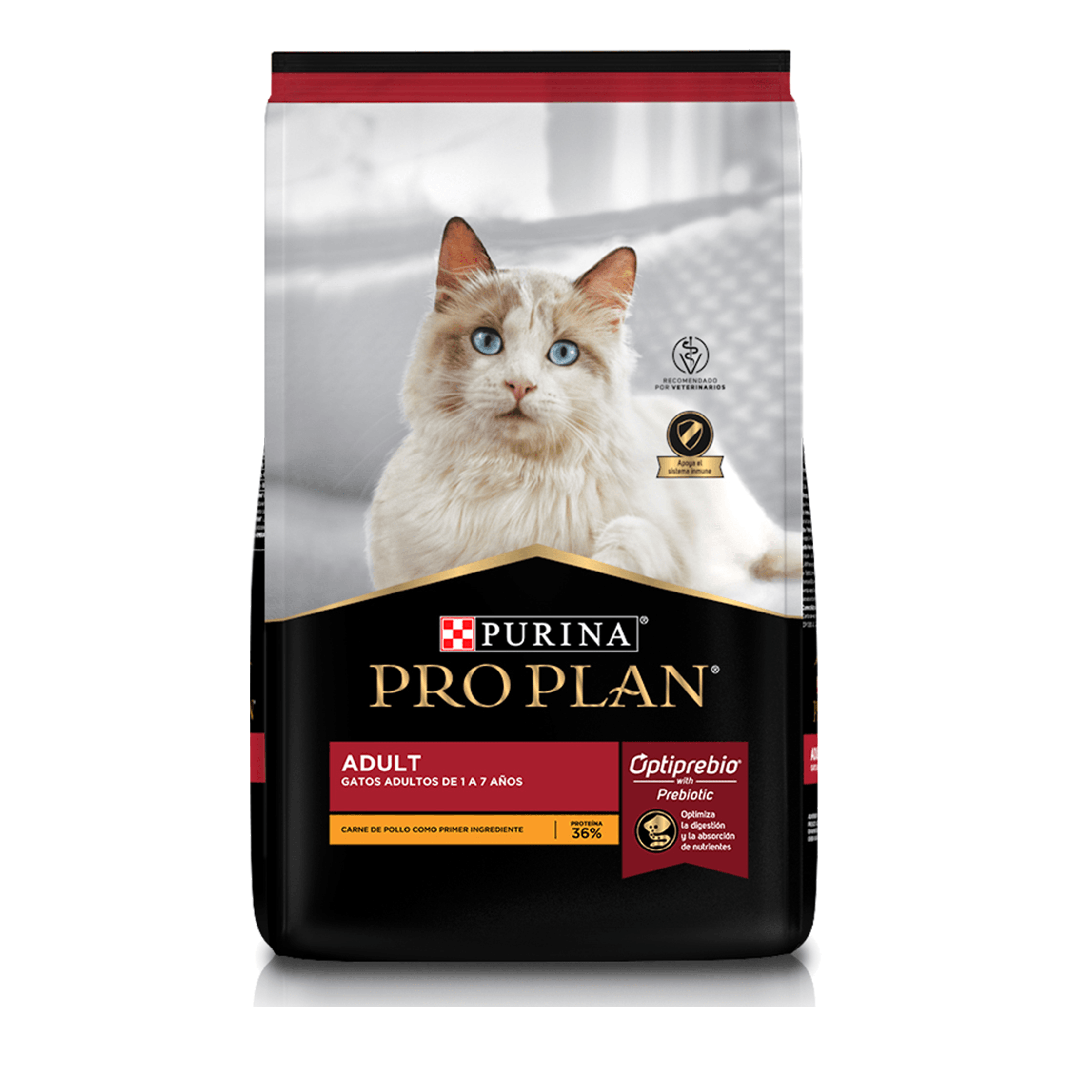 Purina® Pro Plan® Gato Adulto, Alimento Seco OptiPrebio® es un alimento completo y balanceado para gatos adultos de todas las razas con prebióticos y antioxidantes naturales que optimizan la digestión y protegen el sistema inmunológico Creamos un alimento de vanguardia que le ofrece a tu gato una nutrición garantizada, especializada y de gran sabor.Purina® Pro Plan® Gato Adulto, Alimento Seco OptiPrebio® combina prebióticos y antioxidantes naturales que optimizan la digestión y protegen el sistema inmunológico. La tecnología avanzada de OptiPrebio® ayuda a optimizar la digestión, estabilizar la flora intestinal y a mantener fuertes las defensas naturales de tu gato gracias a la combinación de prebióticos y antioxidantes naturales, ayudando a mejorar la absorción de nutrientes clave para una mejor salud digestiva, protegiendo su sistema inmunológico contra las amenzas externas. Tiene tecnología Stone Neutral que ayuda a prevenir la formación de cristales urinarios, manteniendo y protegiendo la salud del tracto urinario inferior. Además la tecnología Tartar Control ayuda a reducir el sarro dental en un 41% (con respecto a fórmula PRO PLAN® Adult Cat sin pirofosfato tetrasódico), promoviendo dientes saludables y más fuertes. Contiene ingredientes de alta calidad, con el balance adecuado de proteínas y grasas, con carne de pollo como principal ingrediente. Alimento completo y balanceado para gatos adultos con tu nivel de exigencia en el cuidado de tu mascota. Ayuda a optimizar la digestión, estabiliza la flora intestinal y mantiene las defensas naturales de tu gato. Ayuda a prevenir la formación de cristales urinarios manteniendo y protegiendo la salud del tracto urinario inferior. Ayuda a prevenir el sarro dental promoviendo dientes fuertes y saludables.
